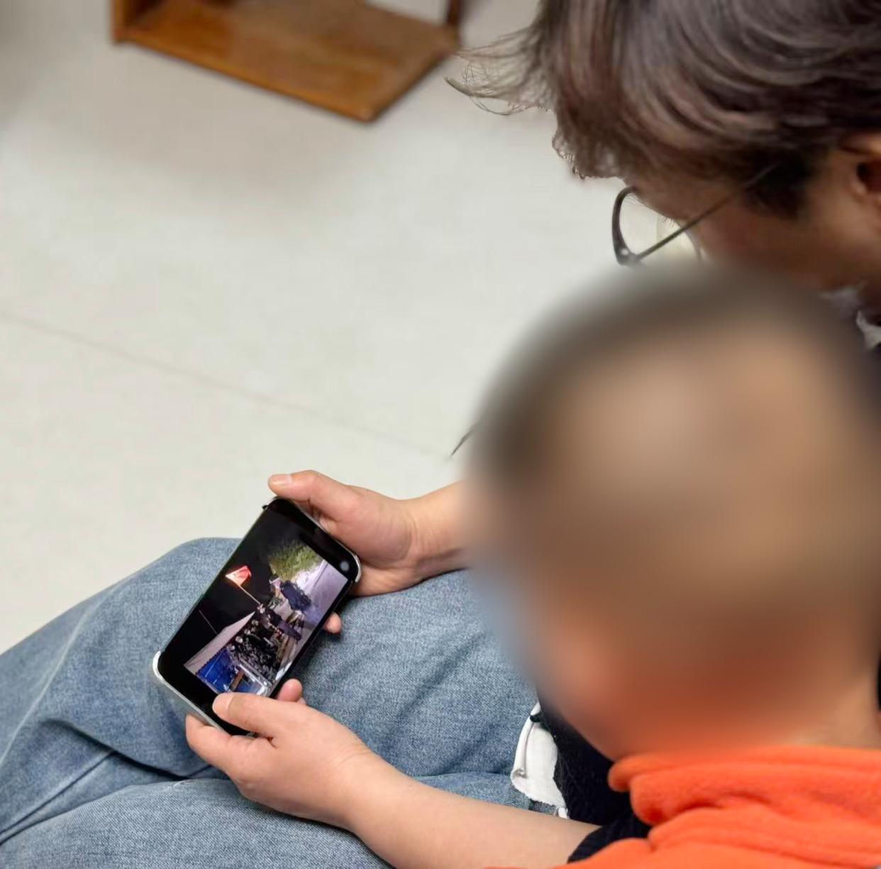 妈妈给儿子看爸爸巡边的视频。新华社发2019年