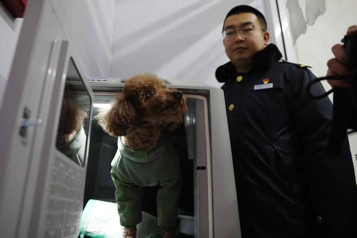 2月1日,在中铁快运兰州西站营业部宠物交接区,一只小狗进入高铁宠物运输专用箱等待托运。新华社记者 陈斌 摄
