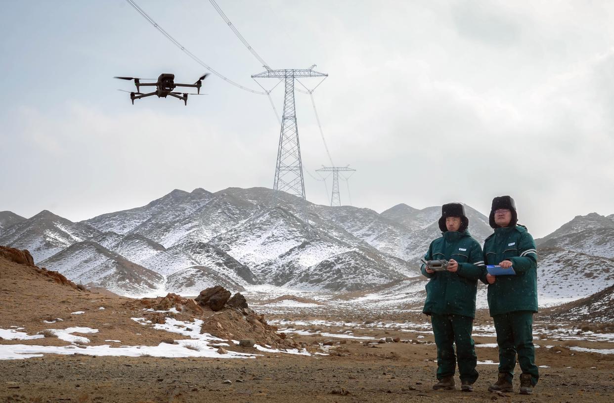 新疆送变电有限公司东疆运检分公司伊吾运维站副班长牛海林(右)使用无人机对哈密—重庆±800千伏特高压直流输电工程进行巡视检查工作。新华社记者 杜刚 摄