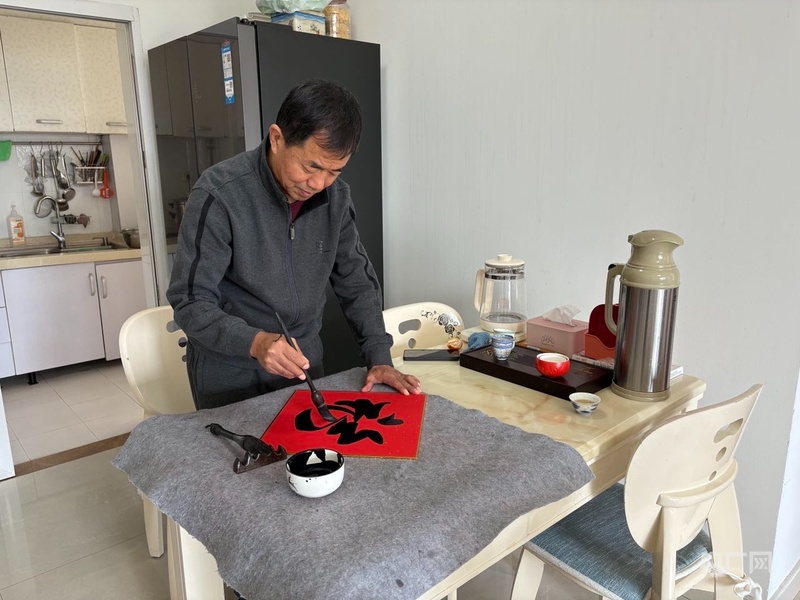 董月长在家中写“福”字(央广网见习记者 钟金秀摄)