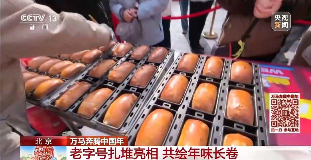 总台央视记者 罗子瑛:来过隆福寺的朋友都知道,这里将传统和潮流结合得特别好,这次新春市集是集结了57个品牌,您知道吗?这里头有超过30家是老字号,老字号之所以能够这么多年依然火爆,靠的就是一点一滴积累的信任。市民游客消费的是情怀,也是放心。瞧我身后这家老字号美食摊位前就已经排起了长队,每天早上10点开始,就会有人在这儿等着师傅现烤面包。我刚刚也是好不容易买到了两个,大果子面包和维生素面包,这一套下来是14块钱,大果子面包已经有一百多年历史了,维生素面包也是在上世纪60年代出品的,它们持续到现在,又成了隆福寺新春市集的爆款。我们看到现场有两个大的烤箱,每一炉面包需要烤制20分钟,然后烘焙师傅再给它涂上黄油,这样一套下来,一整天的时间得销售1000多套,大家可以说是排着队蜂拥而至,吃的就是这股子热乎劲儿。