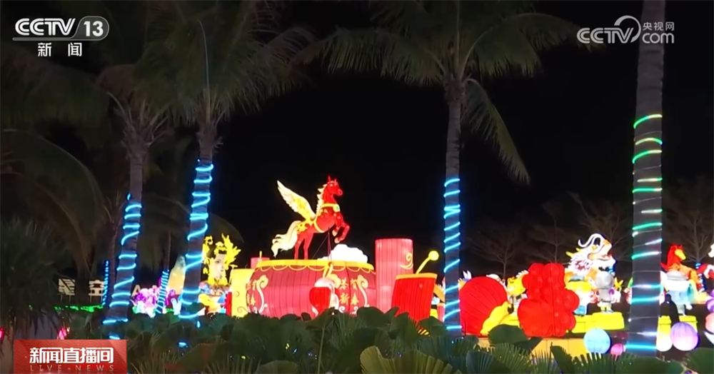在三亚丝路欢乐世界景区内,14组大型主题灯组及彩灯将园区装点成流光溢彩的光影世界。“龙马精神”“骏马迎春”灯组气势恢宏,“国潮戏剧”等灯组将传统彩灯工艺与国潮审美创新融合,一步一景。