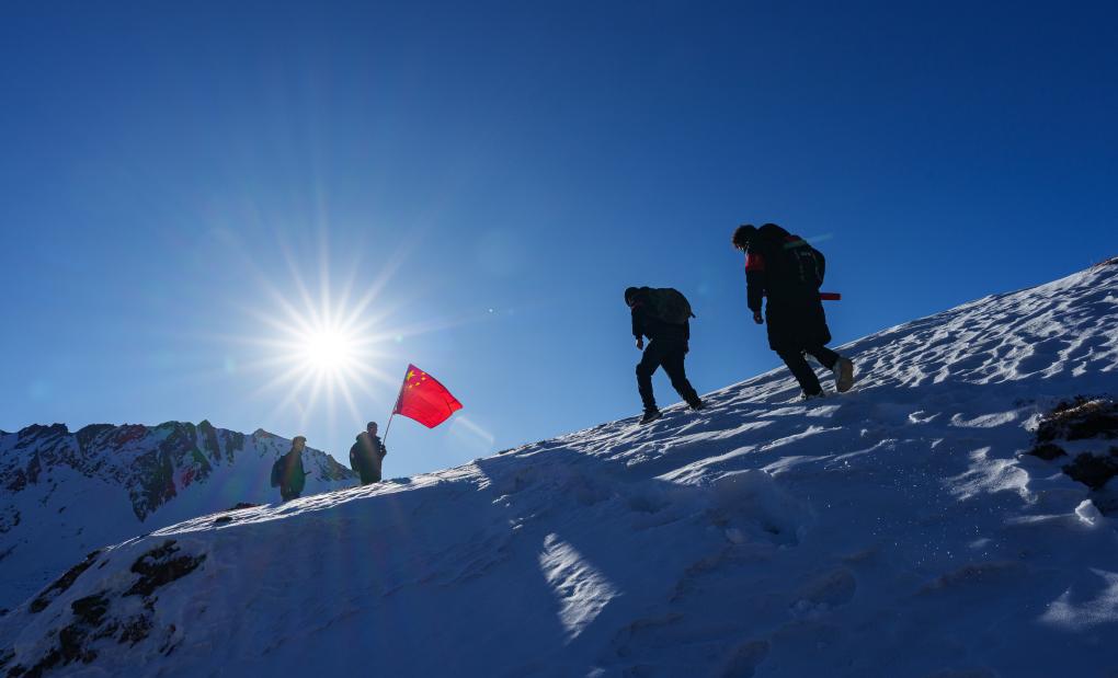 在西藏山南市隆子县玉麦乡境内,护边员们在雪坡上巡逻(2月6日摄)。新华社记者丁增尼达摄