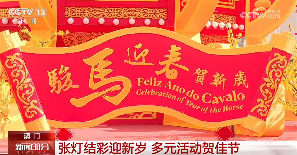在澳门,主要景点和街道春意盎然。以“骏马迎春贺新岁”为主题的大型灯饰及新春花卉展,吸引了众多市民和游客打卡留念。