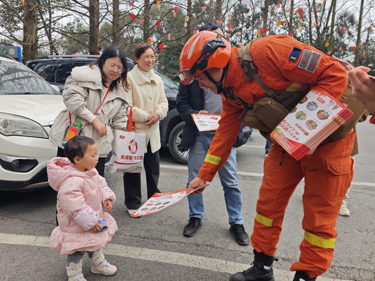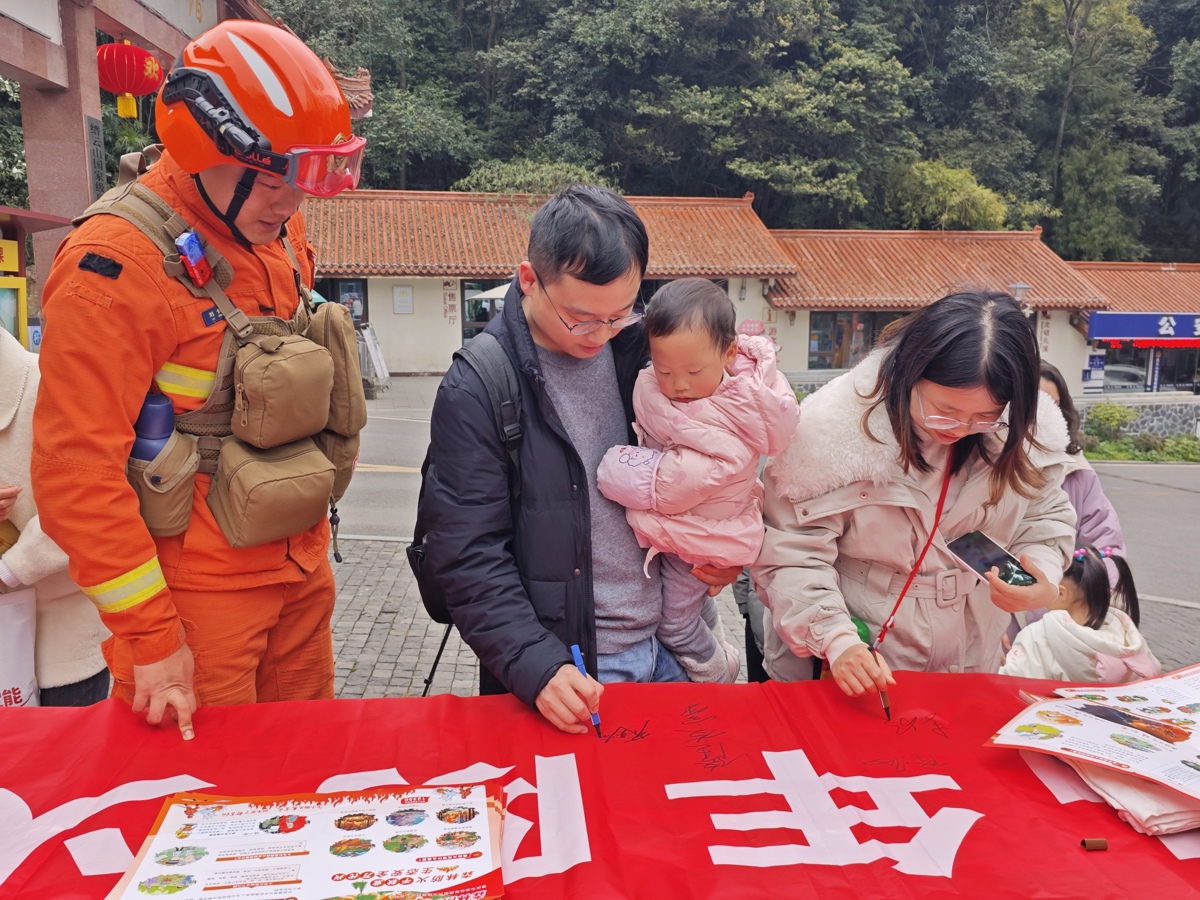下午两点,缙云山景区入口启动防火宣传活动,刘长松就跟着中队开展灭火演示,高压水枪喷出的水柱划破长空,吸引了来往游客驻足。演示结束后,他又转到互动体验区,给孩子们讲解背负式水枪的用法,科普防火常识,引导游客在“一起护缙云”签名横幅上写下承诺。