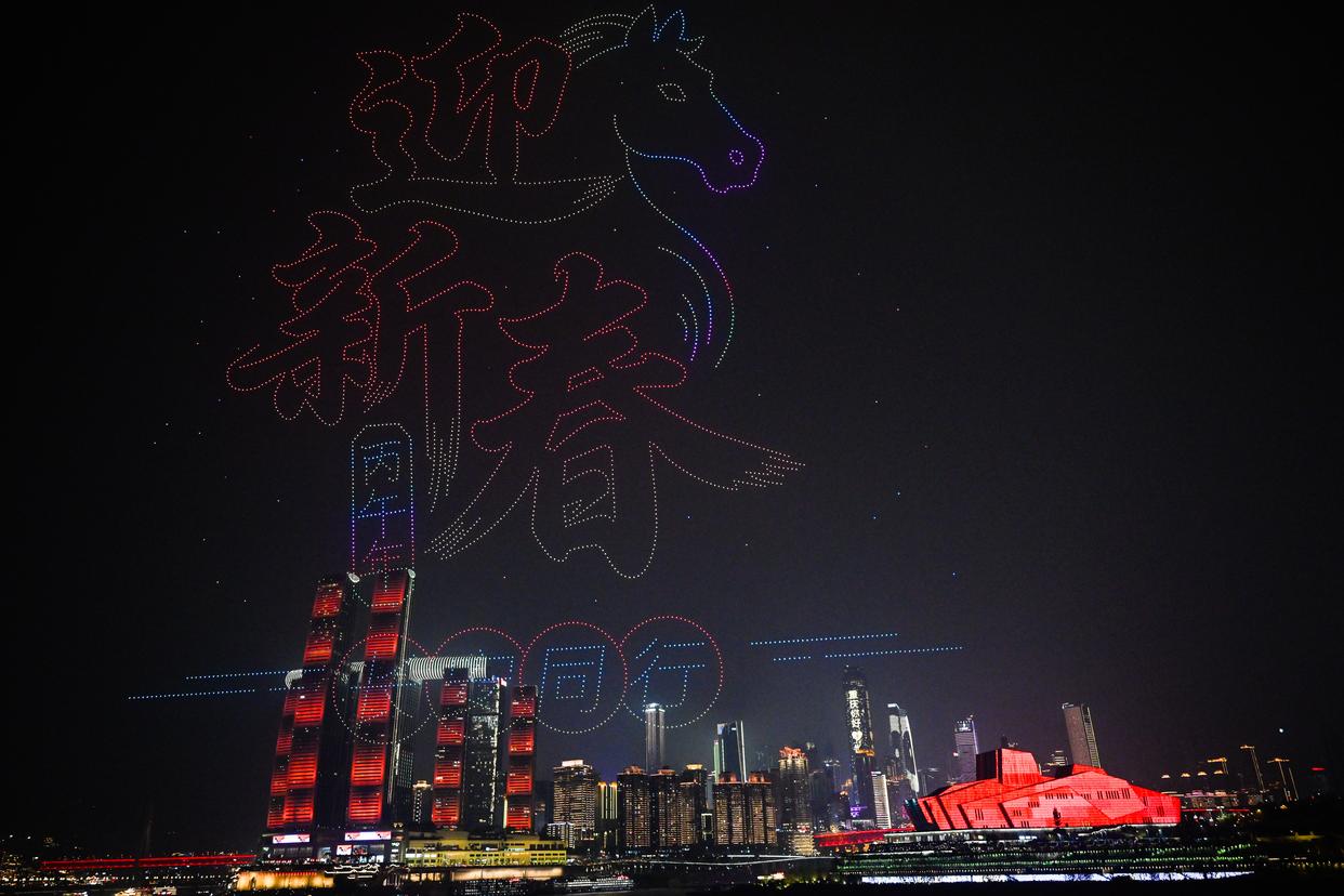 大年初一,“新韵重庆”无人机灯光秀在重庆夜空上演。无人机灯光队列组成各种创意图案,点亮夜空,为观众献上视觉盛宴。