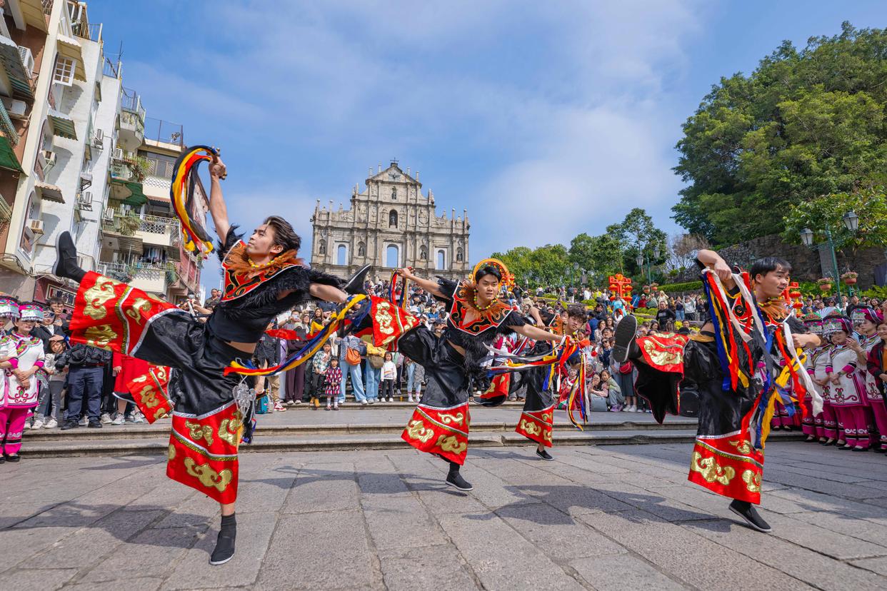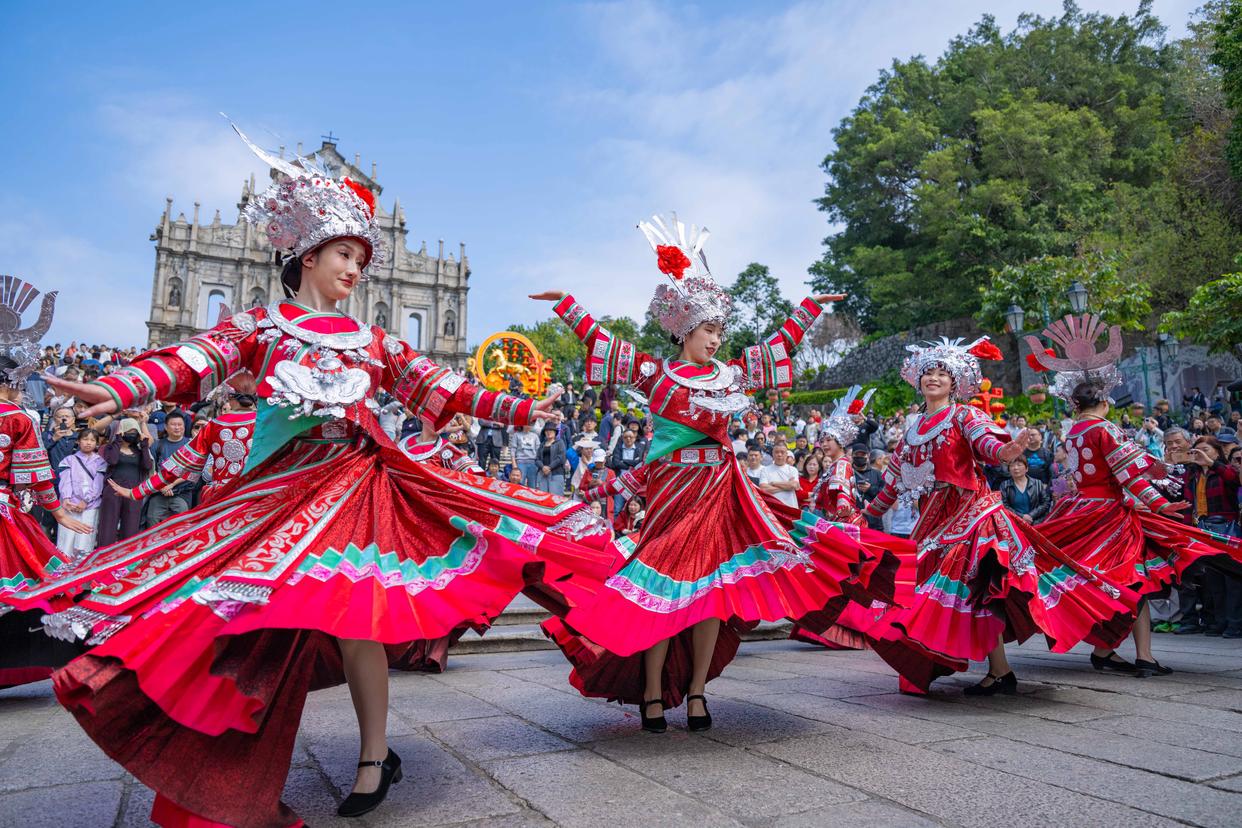 2月18日,贵州表演队在澳门大三巴牌坊前表演舞蹈。新华社发(张金加摄)