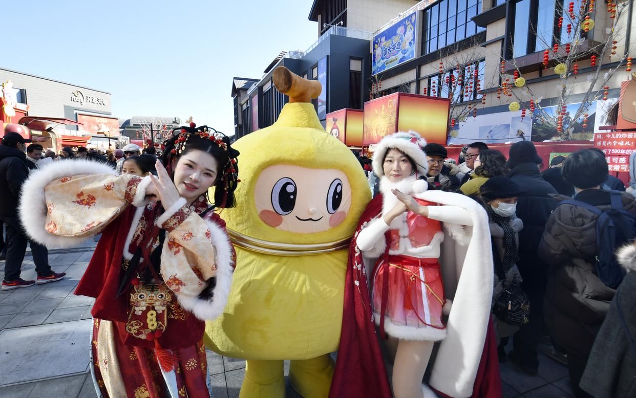 2月18日,在北京隆福寺新春市集上,演员向游客拜年。新华社记者 李欣 摄