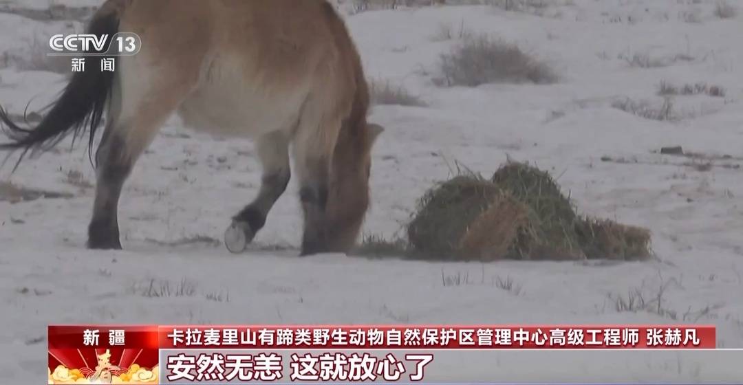 新疆卡拉麦里山有蹄类野生动物自然保护区管理中心高级工程师张赫凡:马找到了,等一会草撒好以后,我们的人都撤离。这些马的膘型还不错,说明它们这个冬天在外面生活的还是适应,马驹也长大了不少,安然无恙,这就放心了。
