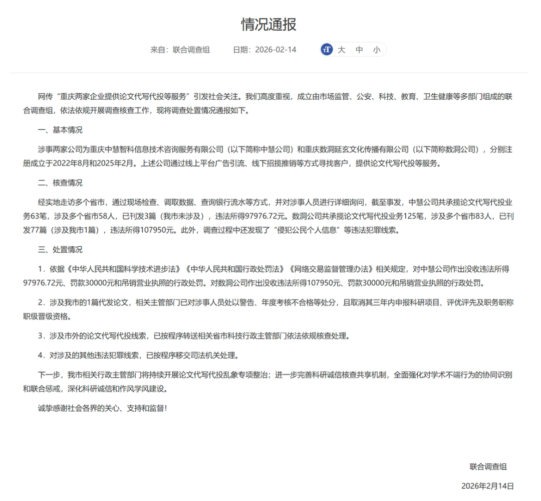 2026年2月14日,联合调查组在重庆市科学技术局官方网站发布情况通报,称成立由市场监管、公安、科技、教育、卫生健康等多部门组成的联合调查组,依法依规开展调查核查工作,调查处置情况通报如下: