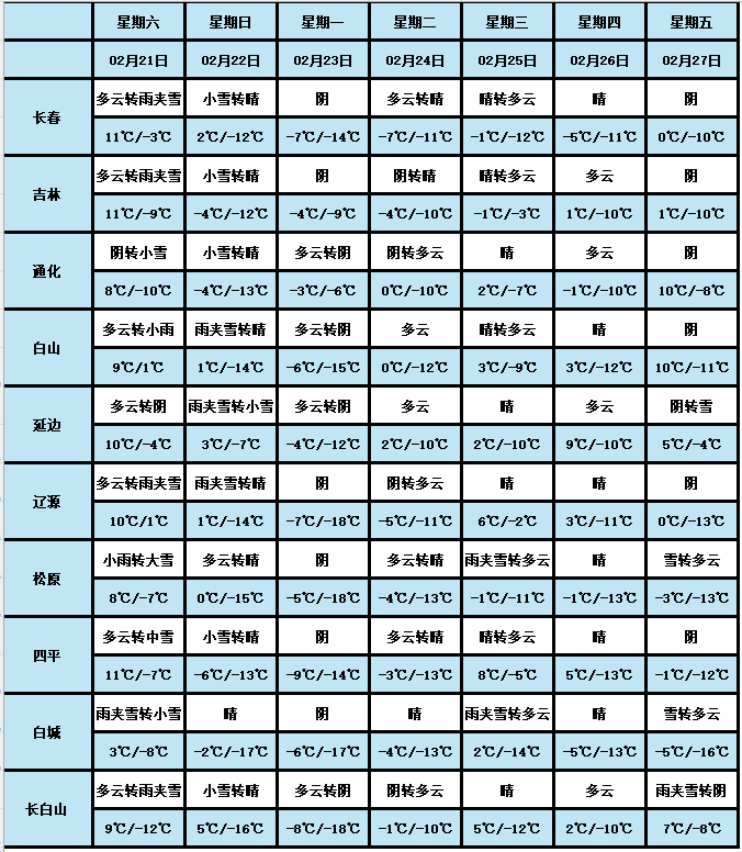 明天夜间到后天白天,全省阴有时多云,白城、松原、长春、四平、辽源、吉林、通化、白山、延边西部和北部、长白山保护开发区有雨夹雪转小到中雪,其中白城东部、松原、吉林东部部分地方有大到暴雪。