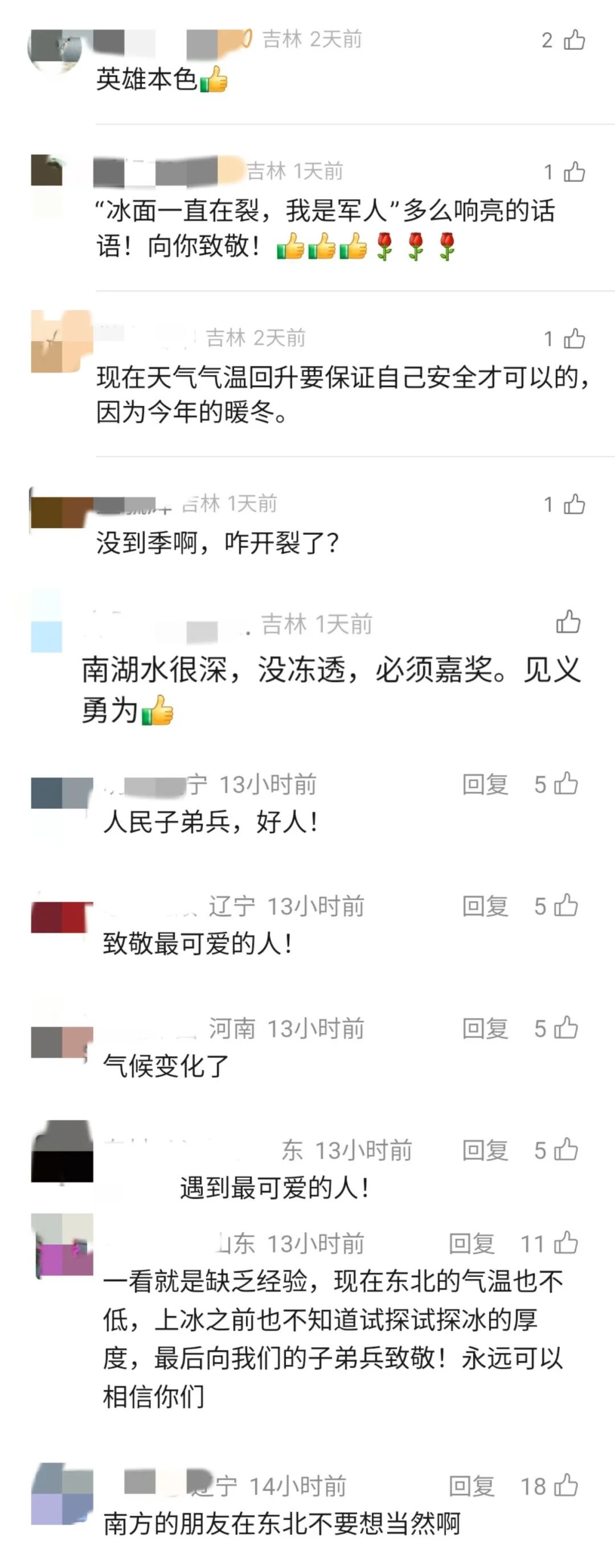 2月17日,2名上海游客在长春南湖冰面行走时,因冰层开裂导致父子二人坠湖,所幸一名休假武警战士迅速匍匐施救,成功将两人救出:“冰面一直在开裂,水已经没过脖子了,没时间犹豫,我是军人!”