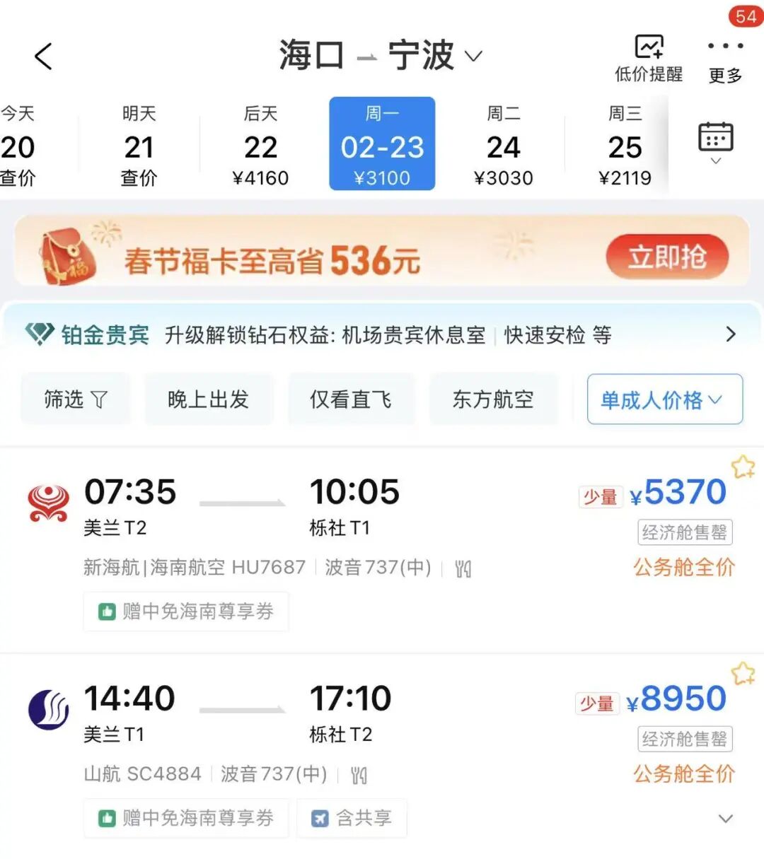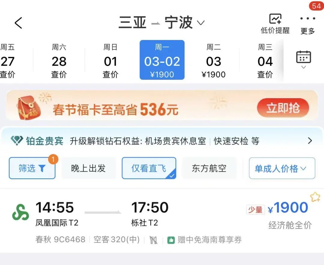 小编查询发现,2月23日以后,宁波至三亚、海口的机票价格仅需数百元。