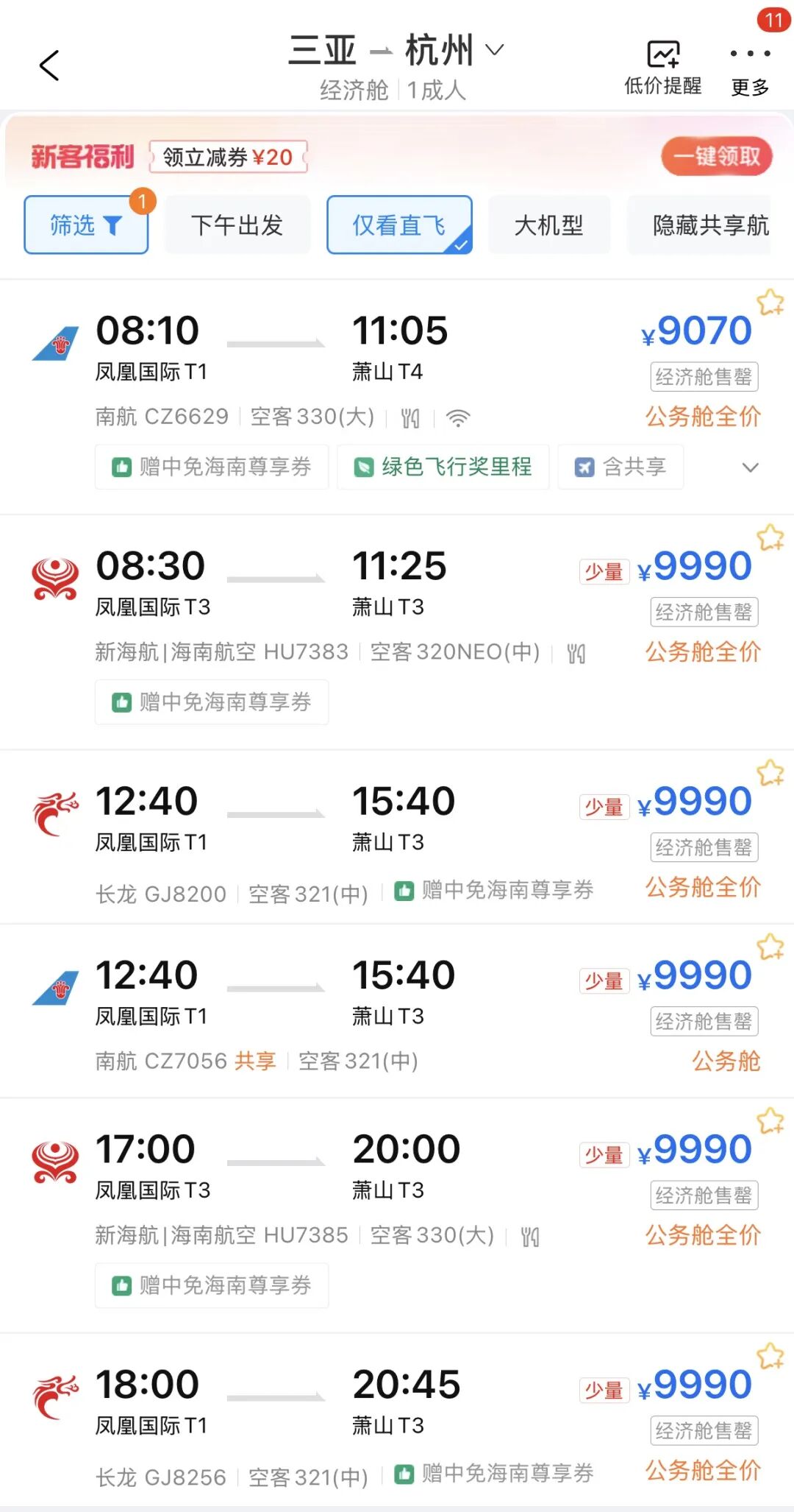 海口直飞宁波还有经济舱全价票