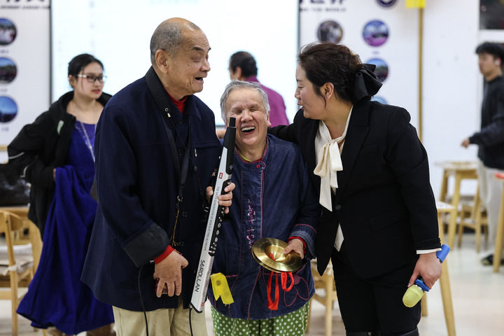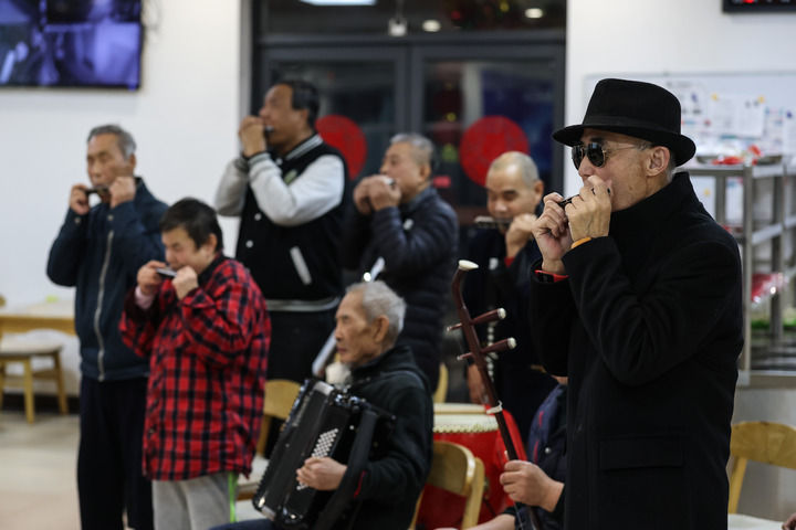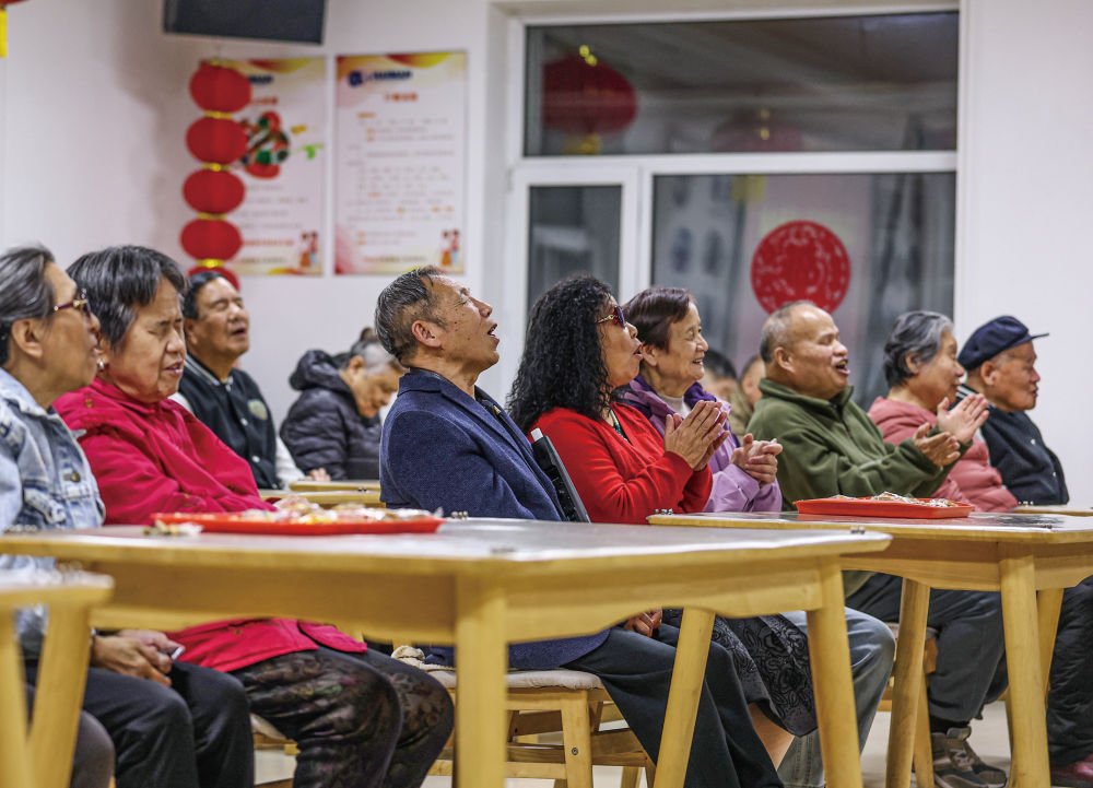2月10日,养老院的老人在联欢会上演奏歌曲。