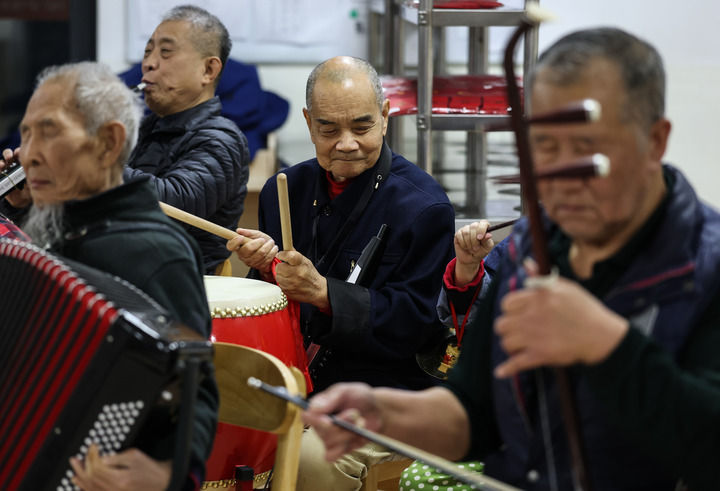 2月10日,养老院的老人在联欢会上演奏乐曲。