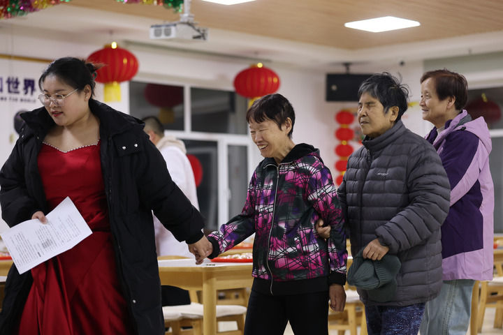 2月10日,养老院的工作人员在联欢会上表演节目。