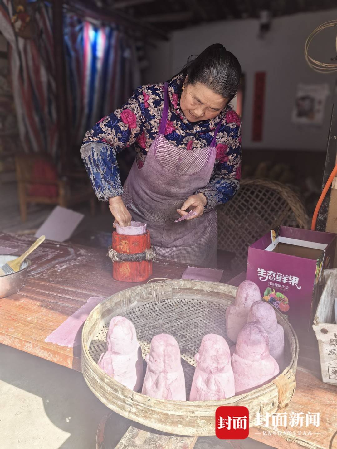 老伴陈奶奶早已守在桌案前,指尖沾着未干的米浆,面前只摆着寥寥几个半成品。“从前一早上能做满满一大筐,如今几个钟头也做不出几个。”陈奶奶朝那几个等着风干的面具努努嘴,笑着对记者说。