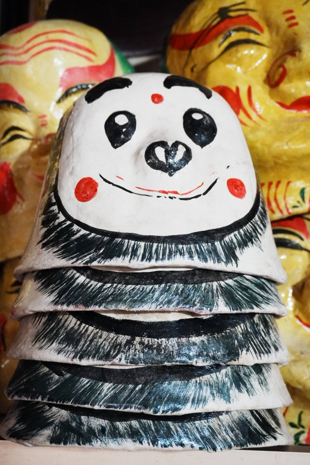 相传源于东汉、曾盛行于川西的笑头和尚面具,曾是舞狮表演的经典道具,以手工草纸、天然米浆糊制彩绘而成,造型喜庆夸张,是川西几代人的经典年味记忆和造型符号。