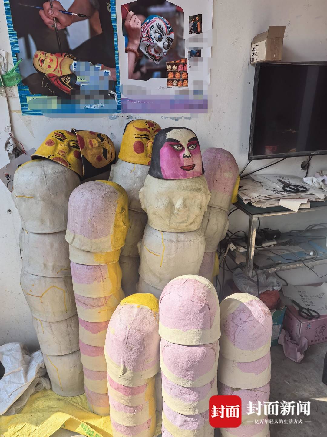 这门手艺,在大邑王泗镇黄家已传了百年。自清朝起,祖辈便以糊制面具为业,1962年,年仅11岁的黄家榜接过竹刀与草纸,成为第四代传人。
