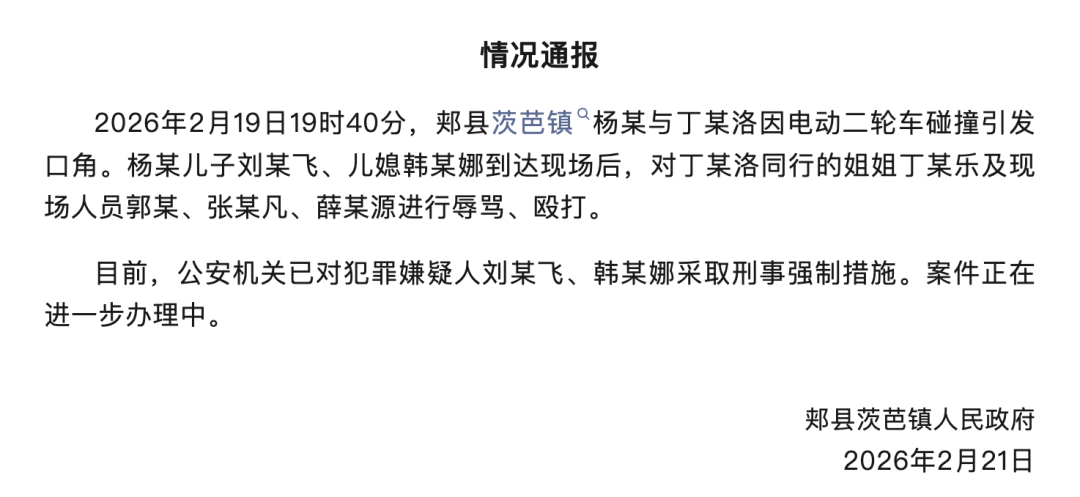 通报称,2月19日19时40分,郏县茨芭镇杨某与丁某洛因电动二轮车碰撞引发口角。杨某儿子刘某飞、儿媳韩某娜到达现场后,对丁某洛同行的姐姐丁某乐及现场人员郭某、张某凡、薛某源进行辱骂、殴打。