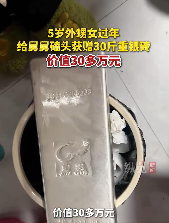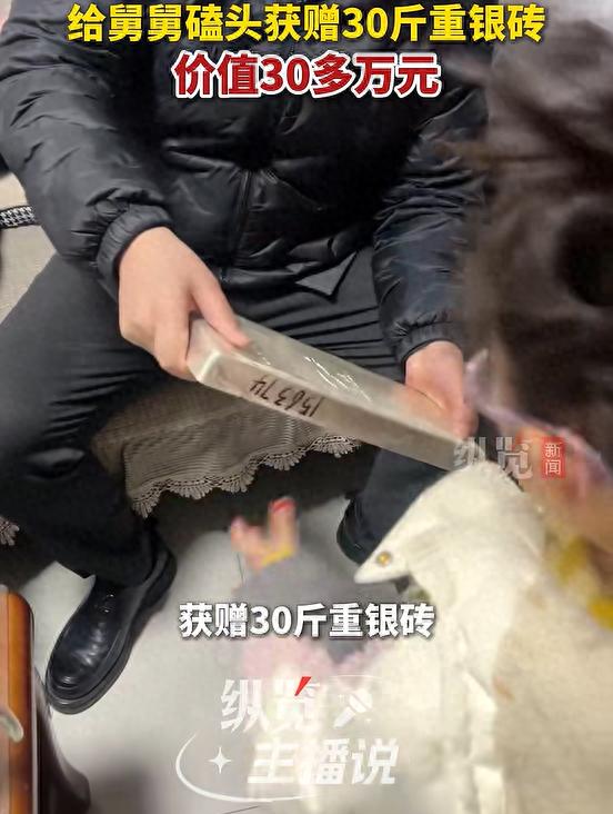 2月21日(采访时间),山东临沂,邵女士在社交平台发布视频称,年夜饭后,哥哥喝了点酒,将车上一块重达30斤、价值30多万元的银砖搬下,称外甥女给自己磕头就把银砖送她,5岁外甥女立刻磕头并送上祝福,舅舅当场兑现承诺。