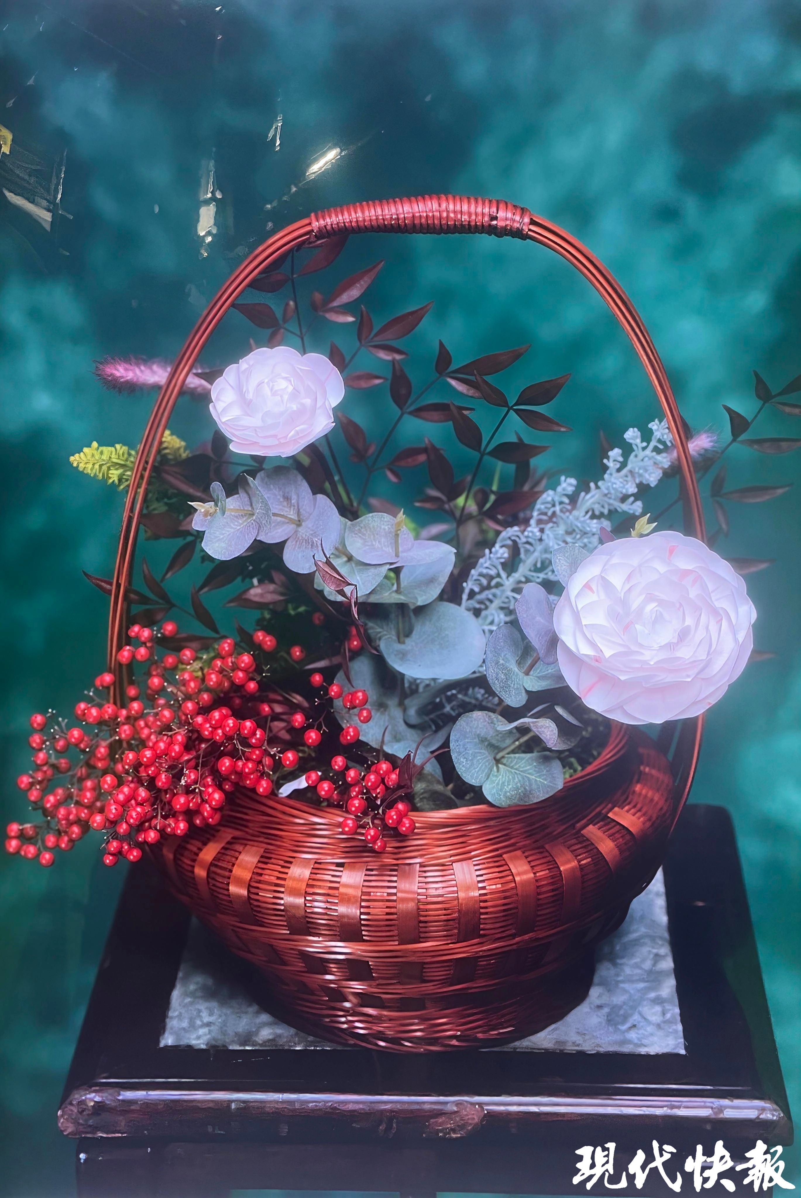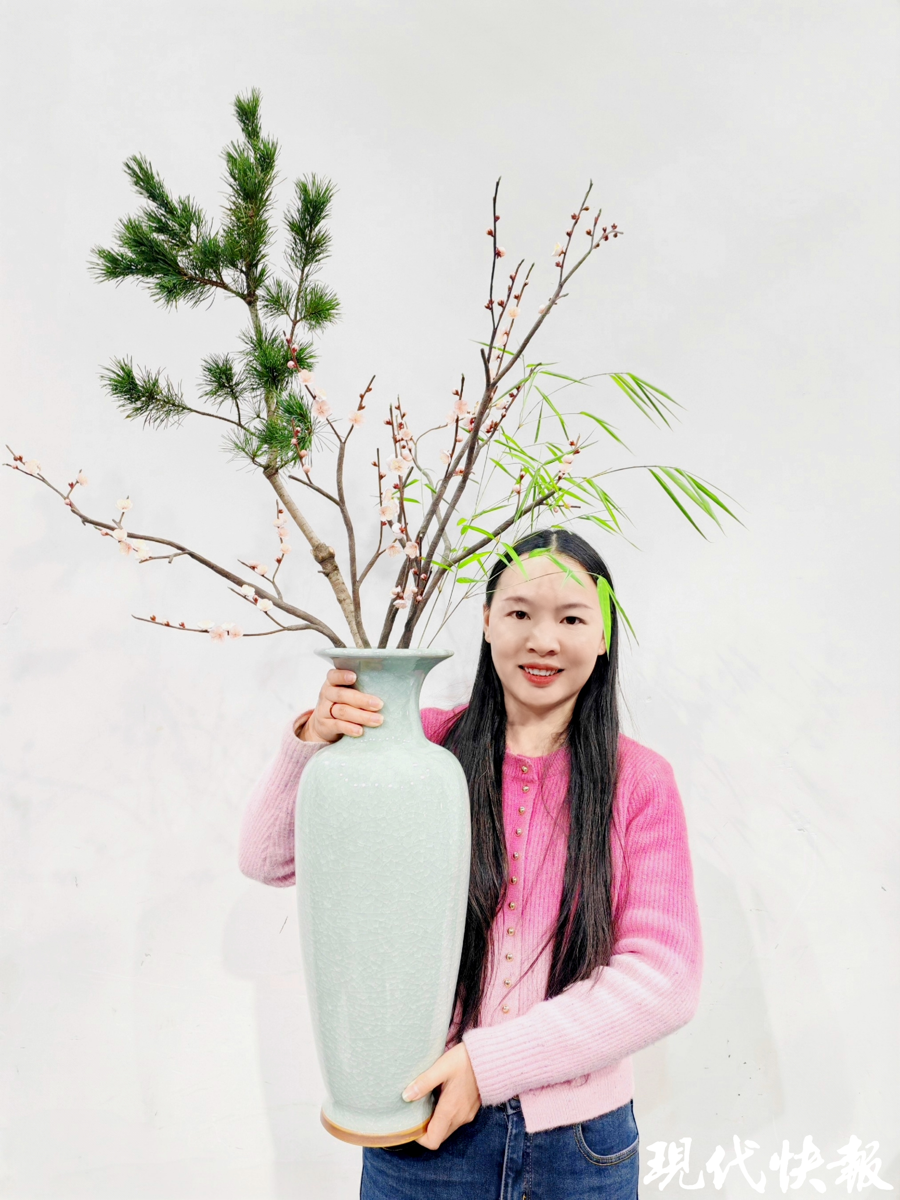 虽然不需要再单独制作模板,但为了设计出精美的造型,朱欣还是翻阅了大量资料,“比如说杏花,我就查阅了大量古画,最终设计出了刘钧老师面前那瓶杏花插花。”