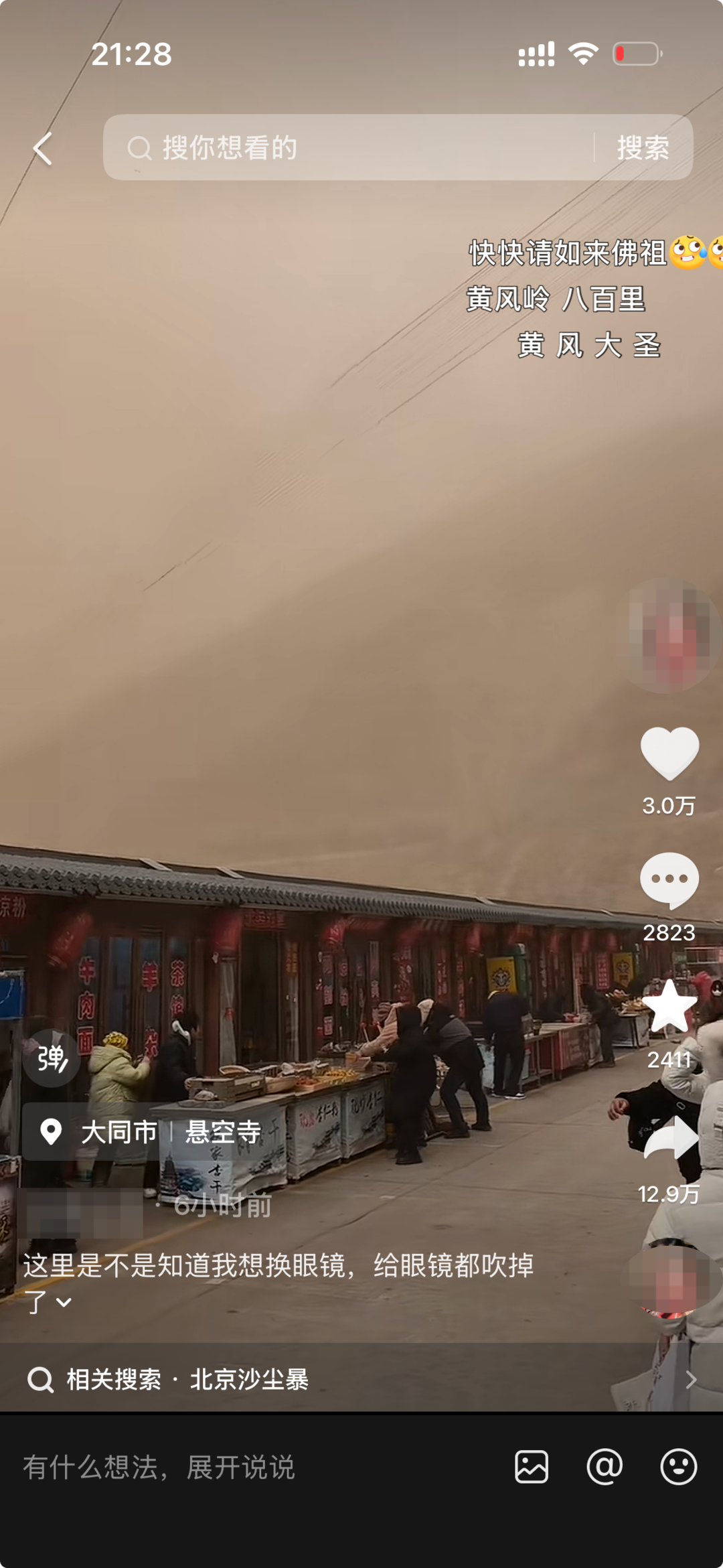 一位21日游览山西悬空寺的游客告诉红星新闻记者,天气从早上开始就不太好,他们是在下午两点左右逛完下山时遇到了大风。该游客拍摄的视频显示,山脚下黄沙漫天,大风将商户摆放的部分商品吹跑,商户在紧急按住自己的摊子。