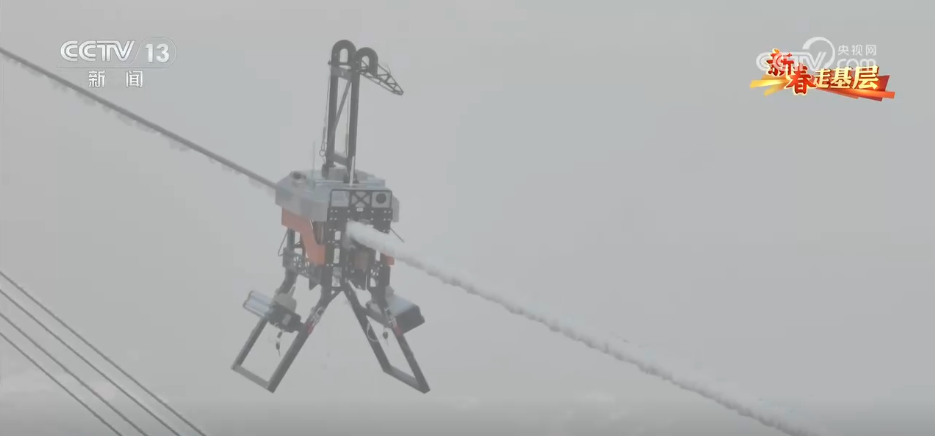 重载无人机的吊装下,除冰机器人上到了高压线上,开始大展伸手。不断旋转的履带是它的“双脚”,它一边快速向前,一边挤压导线上的覆冰。1分钟左右,20多米长的导线覆冰全部被清理干净。