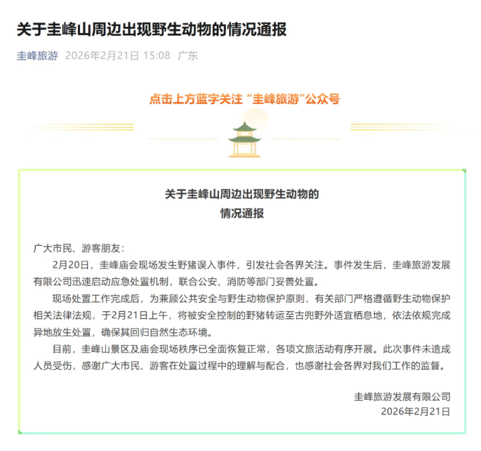 2月20日,圭峰庙会现场发生野猪误入事件,引发社会各界关注。事件发生后,圭峰旅游发展有限公司迅速启动应急处置机制,联合公安、消防等部门妥善处置。