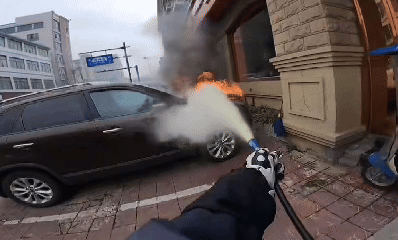 楼质军从网吧前台拎起灭火器,一边拔掉保险栓,一边摇晃瓶身,快步走向冒烟的车辆。等靠近时,他看见车头已经窜出了明火。“整个车头都在烧。”他想也没想,就拿起灭火器对着火焰喷射。