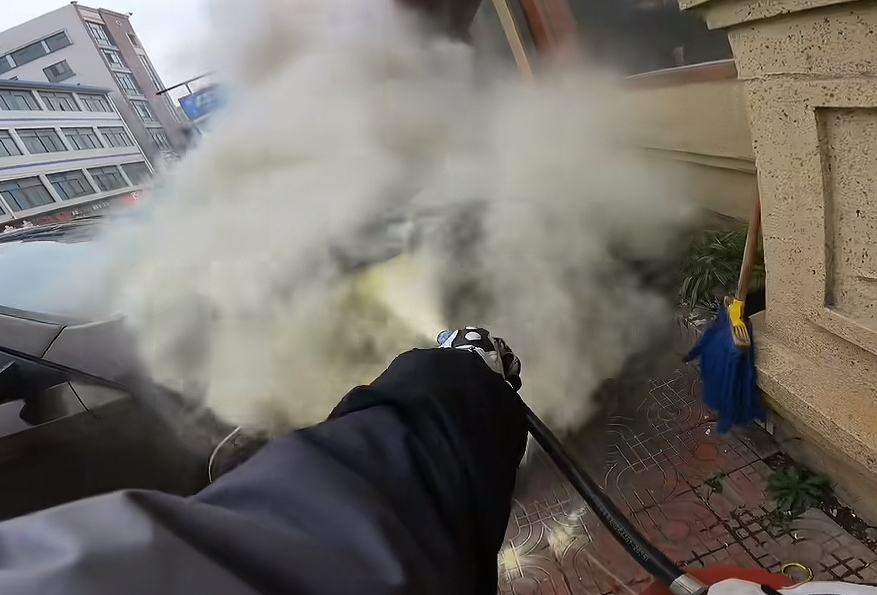 那天出门后不久,楼质军就在街上看到一辆停着的私家车,车头正冒着白烟。
