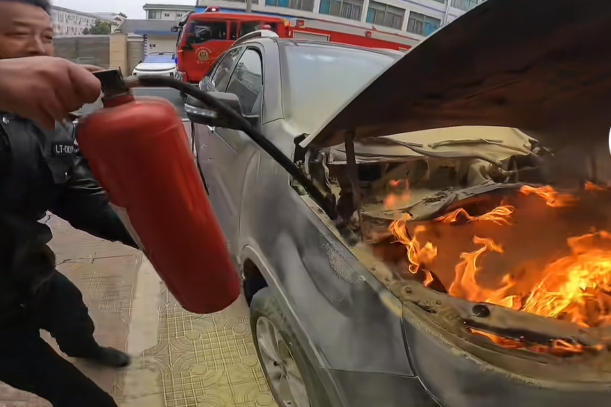 “车头虽看不到明火,但浓烟还是从引擎盖处不断往外冒。”楼质军说,他原本打算撬开一条缝继续灭火,但火烧了一会儿,引擎盖的零部件失效,整块盖子突然弹开,只见整个引擎舱里都在燃烧。楼质军举着灭火器拼命喷射,但火势着实不小。