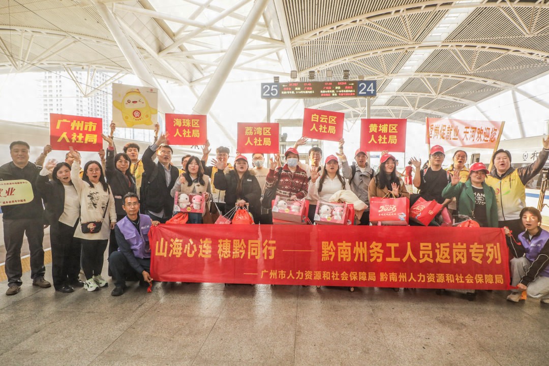 “广州,我们回来啦!”2月22日(农历正月初六)下午5:31,满载着约600名贵州籍务工人员的“山海心连 穗黔同行”返工专列(G2265都匀东——广州)准点驶入广州南站。这趟由广州市人力资源和社会保障局联合黔南州人力资源和社会保障局精心组织的返工专列,为务工人员铺就了一条“出家门、上车门、到厂门”的暖心通道,是全力支持广州企业春节不停工不停产的重要举措。