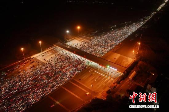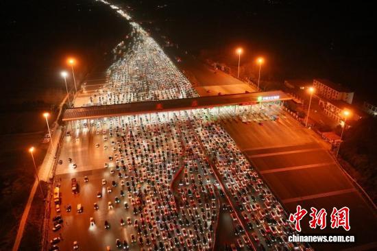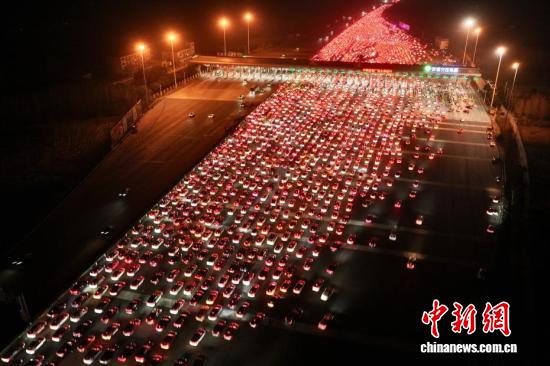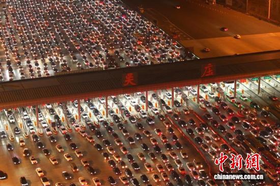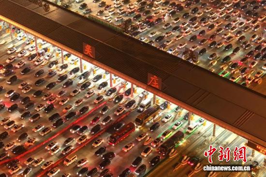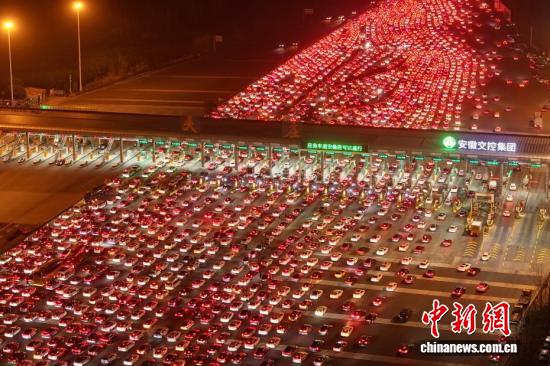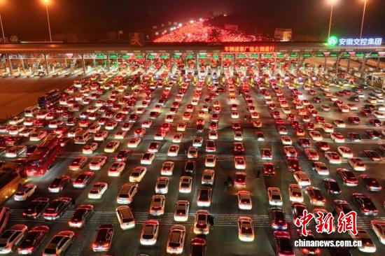 2月22日,正月初六,春节假期进入尾声,全国迎来返程客流高峰。位于安徽省全椒县、毗邻皖苏两省交界的吴庄收费站,迎来密集返程车流。该收费站双向共设有36个车道,是目前国内车道数量最多的高速公路收费站。图为在吴庄收费站,车辆有序通行。