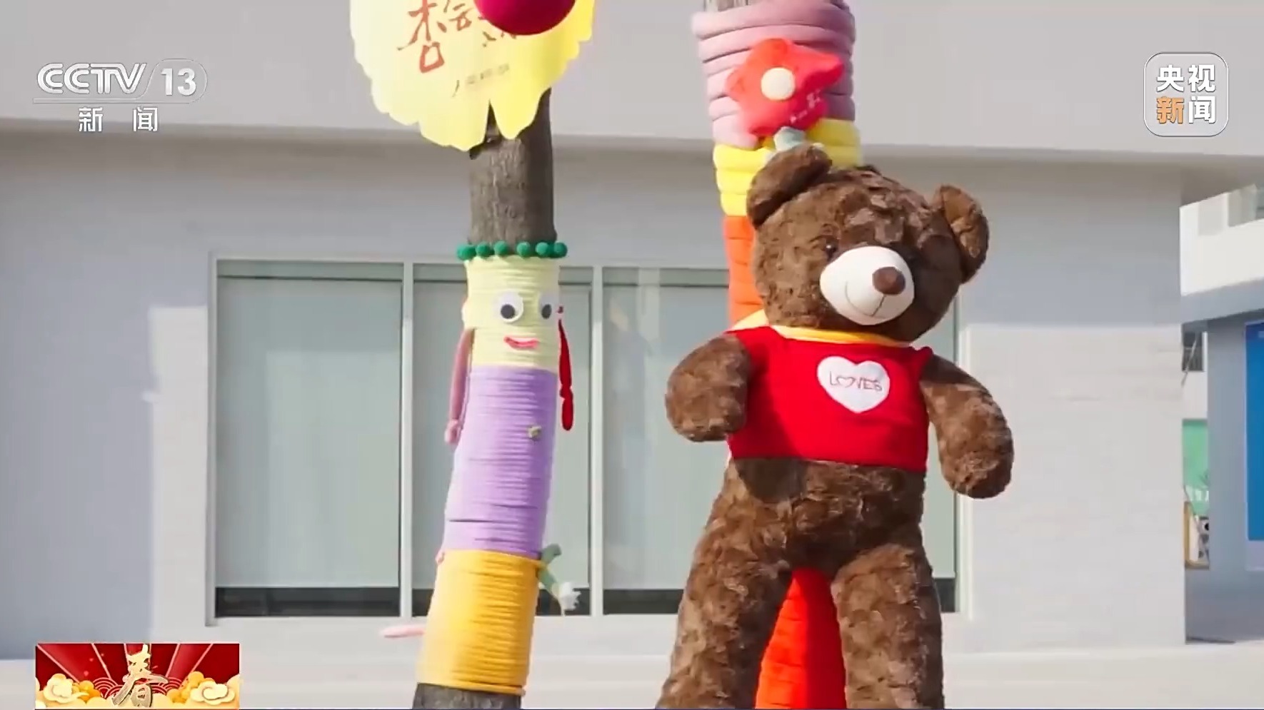 四川成都,街道、公园的树木换上“新装”迎来新春。凤翔湖公园街区多巴胺配色的“抱抱树”惊喜上线,可爱又治愈的毛绒公仔们,吸引市民游客纷纷前来“抱抱”;成都新津街旁的树木换上了童趣毛线“新衣”,新春氛围感拉满。