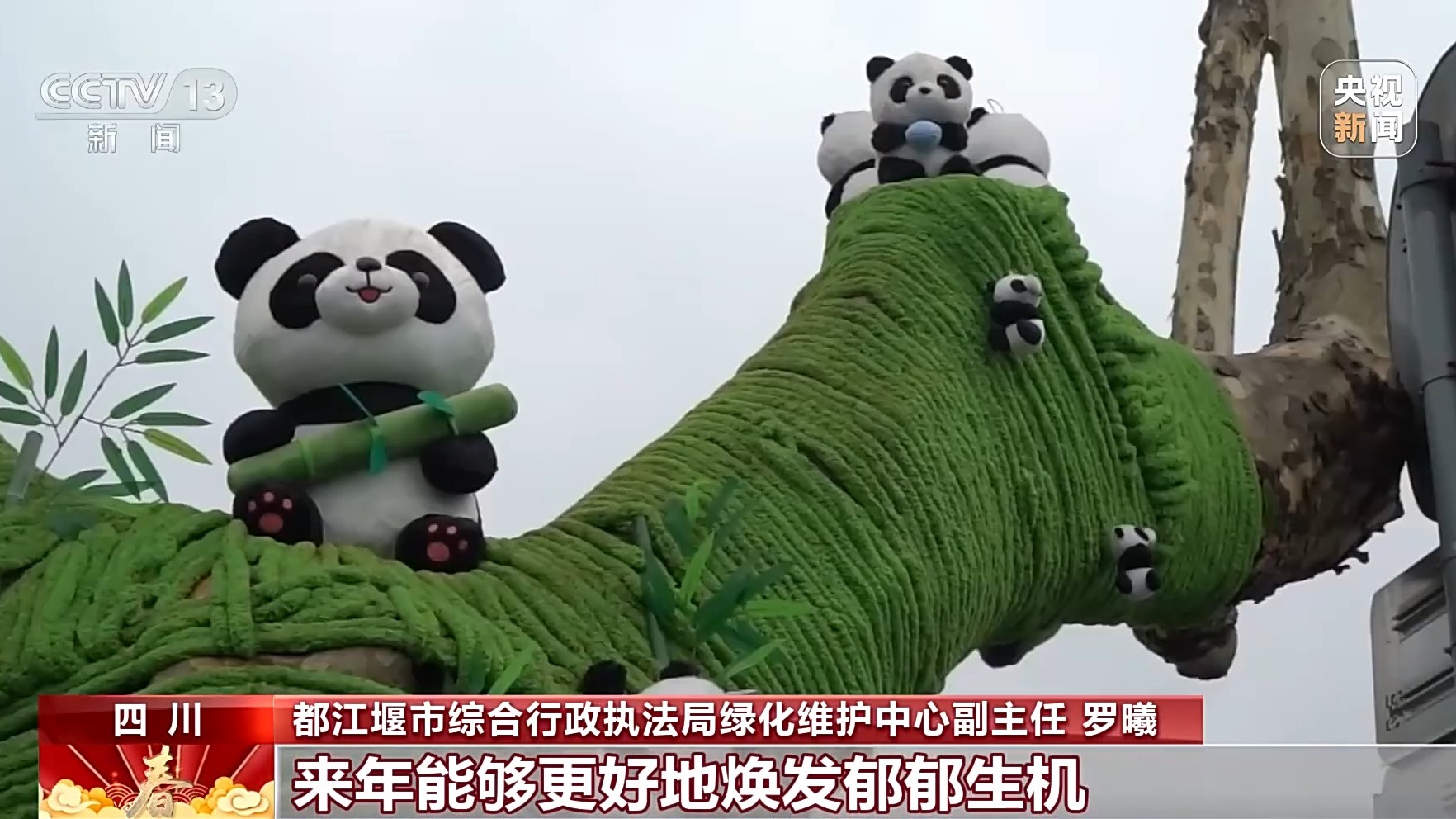 在都江堰复兴街,梧桐树披上了彩色的绒线“冬衣”,还有憨态可掬的熊猫悄悄“爬”上树梢。