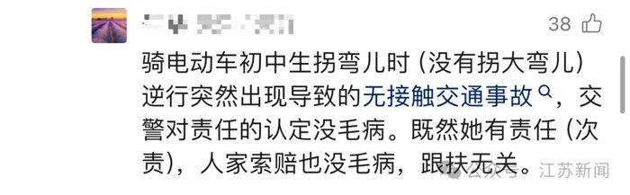 也有不少网友在观看视频之后,认为交警判定无误,因为女孩拐弯时突然出现,导致无接触交通事故,女孩应该要承担次要责任。