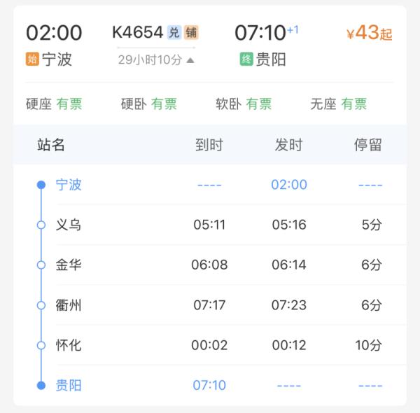 宁波到贵阳的K4654次是今年铁路宁波站的一趟增开列车,凌晨2点从宁波站始发,中途仅停义乌、金华、衢州和怀化,次日清晨7:10到贵阳站,全程29小时10分钟。