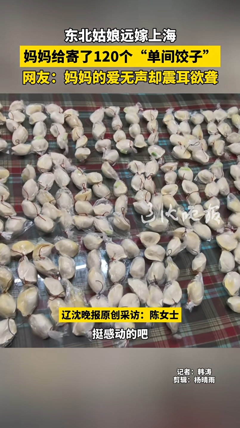 近日,上海的陈女士收到了妈妈从东北寄来的120个饺子。因为女儿今年过年没有回去,且又是远嫁到了千里之外,妈妈特别担心路上饺子会化成一坨。于是,四个饺子装一个袋,饺子之间又用绳子系上,这样就保证每个饺子都住进了单间……女儿收这些到妈妈亲手包的饺子时,幸福满满!
