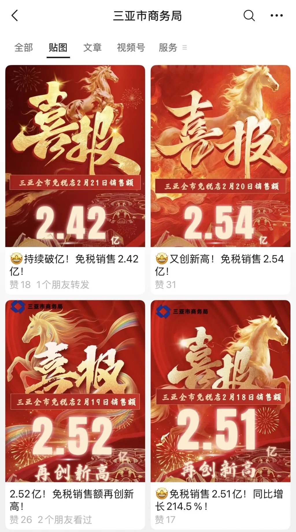 澎湃新闻发现,自马年春节大年初一(2月17日)以来,三亚市的免税销售总额连续5天突破2亿元。2月17日,三亚市四家离岛免税店销售总额2.04亿元,创“年初一”新高。2月18日,三亚市四家离岛免税店销售总额达2.51亿元,同比增长214.5%(农历同比增长36.7%),其中cdf三亚国际免税城销售额单日破2亿。2月19日,三亚市四家离岛免税店销售总额2.52亿元,同比增长262.6%(农历同比增长27.6%)。2月20日,三亚市四家离岛免税店销售总额2.54亿元,同比增长281.7%(农历同比增长28.7%)。
