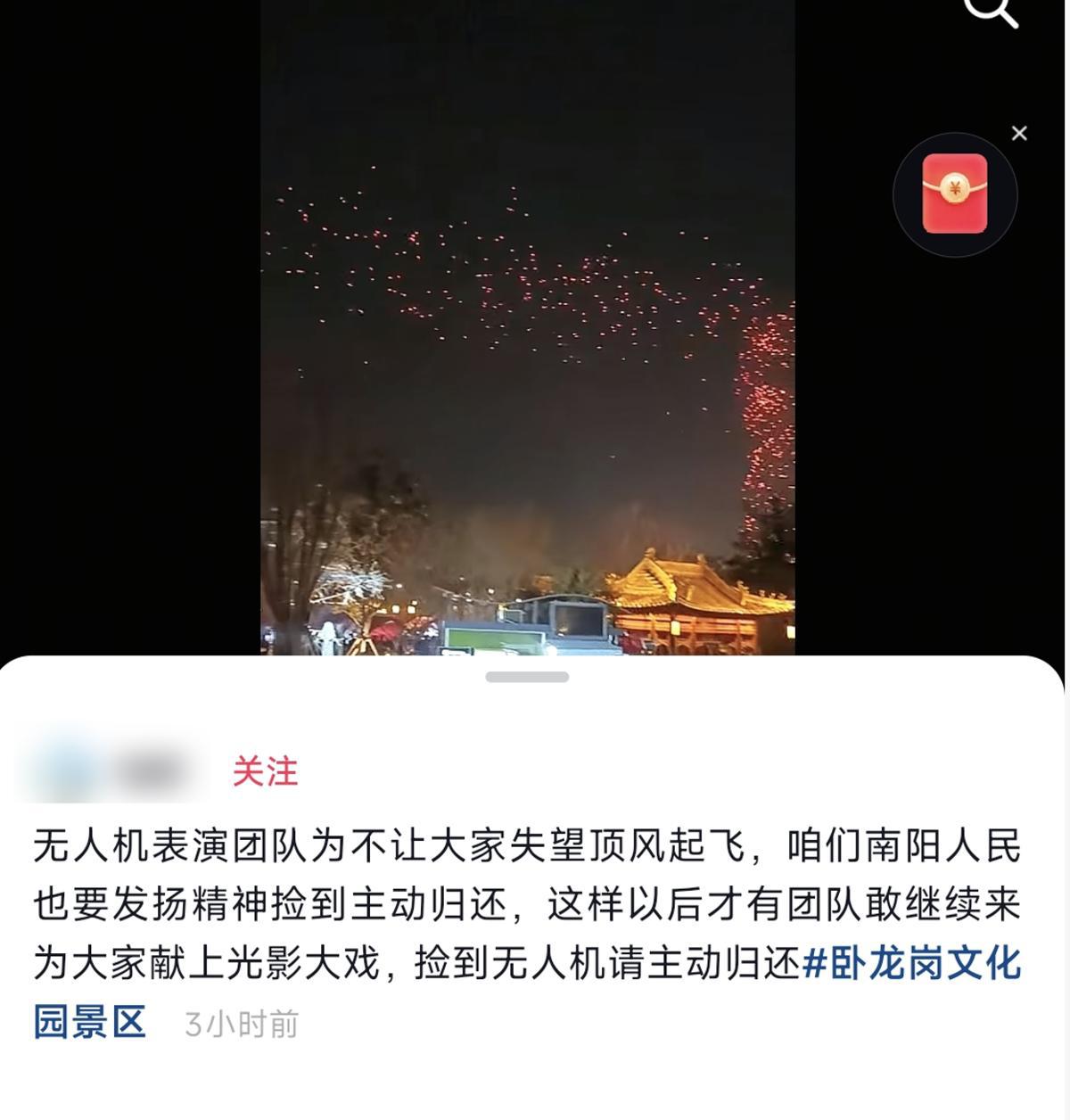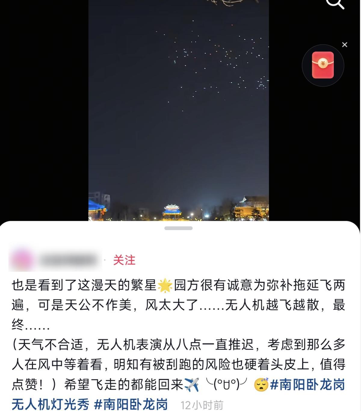 极目新闻记者也注意到,不少南阳网友在网上对因天气原因造成的表演不及预期表示理解。他们称,为了不让游客失望,景区及技术团队依然迎风将无人机升空进行表演,呼吁大家发现掉落的无人机及时归还。