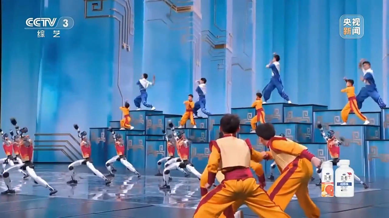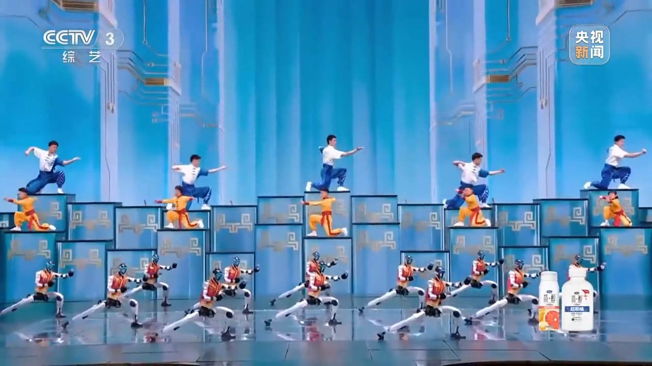 依托实时感知与动态平衡技术,机器人表演融入太极拳、八极拳、六合拳、醉拳、齐眉棍、双节棍、剑术等武术招式,还有各种空翻、跑酷特技动作。既有诙谐的逗趣,也有热血的齐练,尽显科技与武术融合的奇特魅力。
