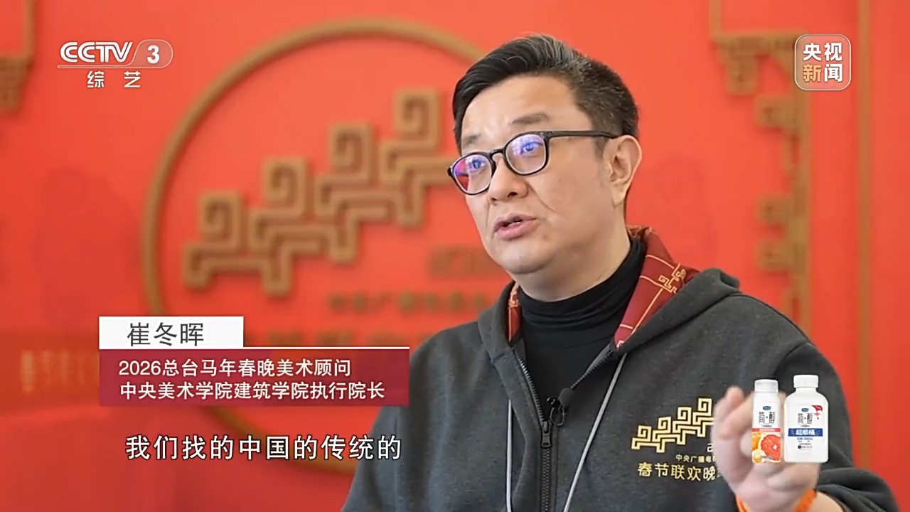 2026总台马年春晚美术顾问、中央美术学院建筑学院执行院长 崔冬晖:主持人后背景的这个装置,我们找的是中国传统文物当中龙纹作为打底,仿玉的这种形式,外圈是龙纹,里边是用的梁思成先生整理的马纹作为中间的内核,中心的部分就是一个“柿蒂纹”形式,三层关系,用图案表达了龙马精神,也表达了骐骥驰骋。