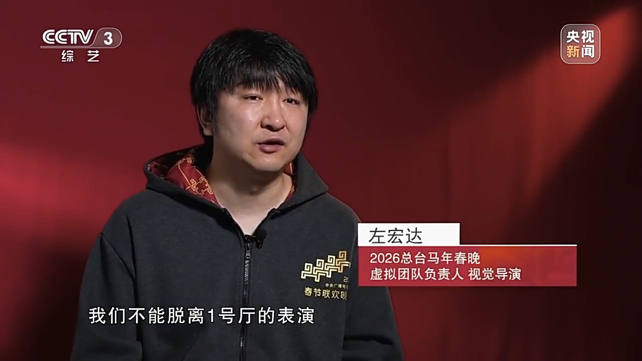 2026总台马年春晚虚拟团队负责人、视觉导演 左宏达:它的这个理念和初衷其实是我们不能脱离1号厅的表演,一切的效果,要基于1号厅,要从1号厅延展出去。