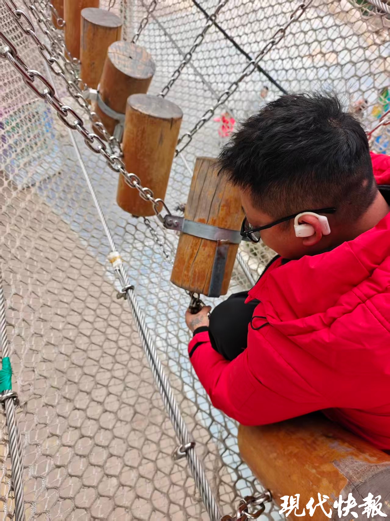 “估计孩子在过铁索桥的时候不小心弄掉了右侧的耳蜗,铁丝网晃来晃去,最终耳蜗吸附在了木墩下面的螺丝上。”杨宏伟分析说。21日一早,到班后的杨宏伟立即联系朱女士,让她来景区认领人工耳蜗。
