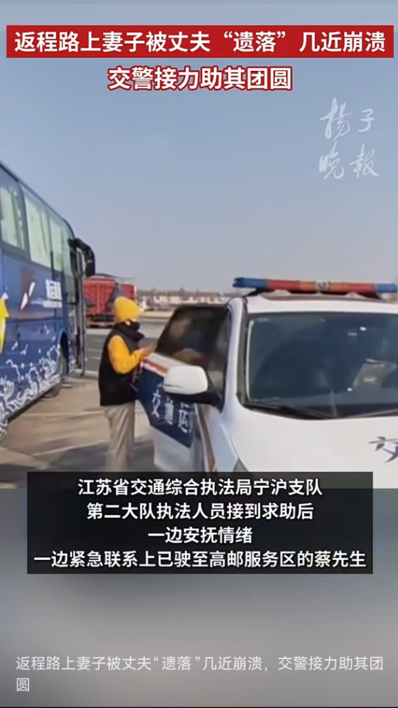 “您别着急,我们马上帮您联系!”执法人员一边耐心安抚徐女士的情绪,一边想方设法联络其丈夫。经紧急查询沟通,最终成功联系上已驾车抵达京沪高速高邮服务区的蔡先生。此时他才惊觉妻子被“遗落”,懊悔不已,当即表示立即停车等候。