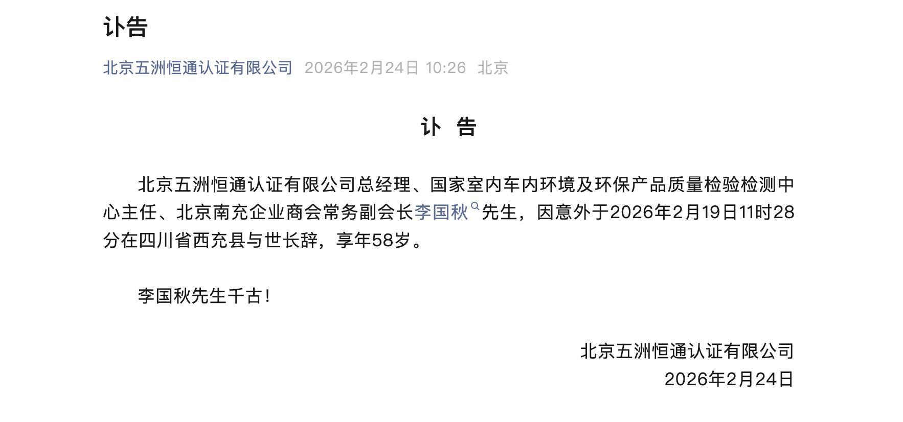 2月24日,北京五洲恒通认证有限公司发布讣告,公司总经理、国家室内车内环境及环保产品质量检验检测中心主任、北京南充企业商会常务副会长李国秋,因意外于2026年2月19日11时28分在四川省西充县去世,终年58岁。