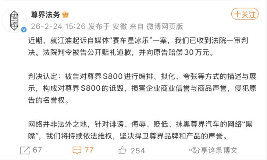 2月24日,尊界汽车法务官方微博发布声明称,近期,就江淮起诉自媒体“赛车星冰乐”一案已收到法院一审判决。法院判令被告公开赔礼道歉,并向原告赔偿30万元。