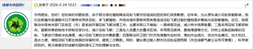 成都市林园局回应称已系统开展花粉飞絮治理工作